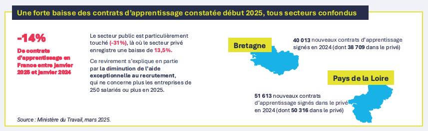 - D'un côté, on constate un recul des contrats d'apprentissage (-14% environ) sur le périmètre observé.