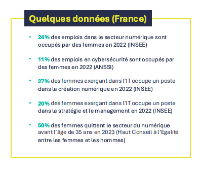 Aujourd'hui, les femmes représentent environ 25% des emplois du numérique et seulement 11% en cyber-sécurité. Près de la moitié d'entre elles quittent ces métiers avant 35 ans, souvent à cause des stéréotypes persistants, de l'isolement des équipes techniques, d'un manque de mentorat ou encore de pratiques de recrutement peu inclusives.