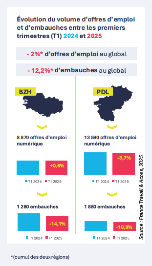 Les pôles urbains de Nantes, Angers et Rennes continuent toutefois de tirer la croissance régionale, ces villes restent les moteurs d'emplois IT dans les deux régions.