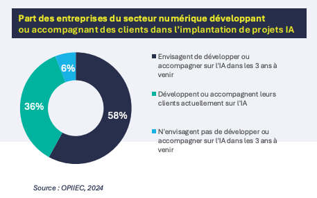 Dans les entreprises du numérique, 36% déploient déjà des projets autour de l’intelligence artificielle, 58% envisagent de le faire d’ici 3 ans, et une minorité (6%) n’envisage pas encore de déploiement.